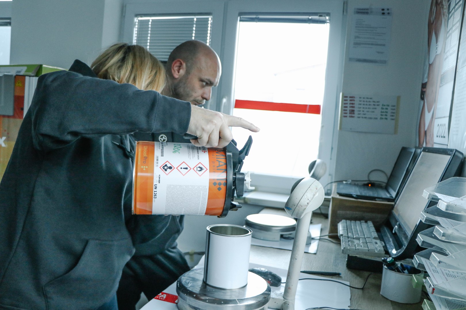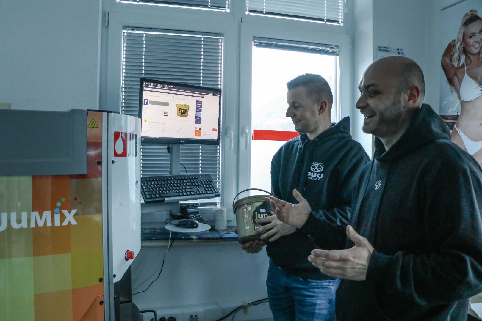V naši prodajalni imamo tudi urejen velik prostor za namen mešanja barv. Postavljenih imamo več mešalnic različnih proizvajalcev. Mešalnice nam omogočajo mešanje barv za široko potrošnjo, kot industrijsko porabo. Med drugim mešamo tudi avtolake , pokrivne barve za les in kovino, notranje in fasadne barve, skratka skoraj vse, kar se v tej panogi lahko zmeša. Pretežno se danes mešajo barve po recepturah, a kljub vsej tehnologiji se pa velikokrat še vedno pojavi potreba po mešanju na vzorec, za kar imamo strokovno usposabljen kader.